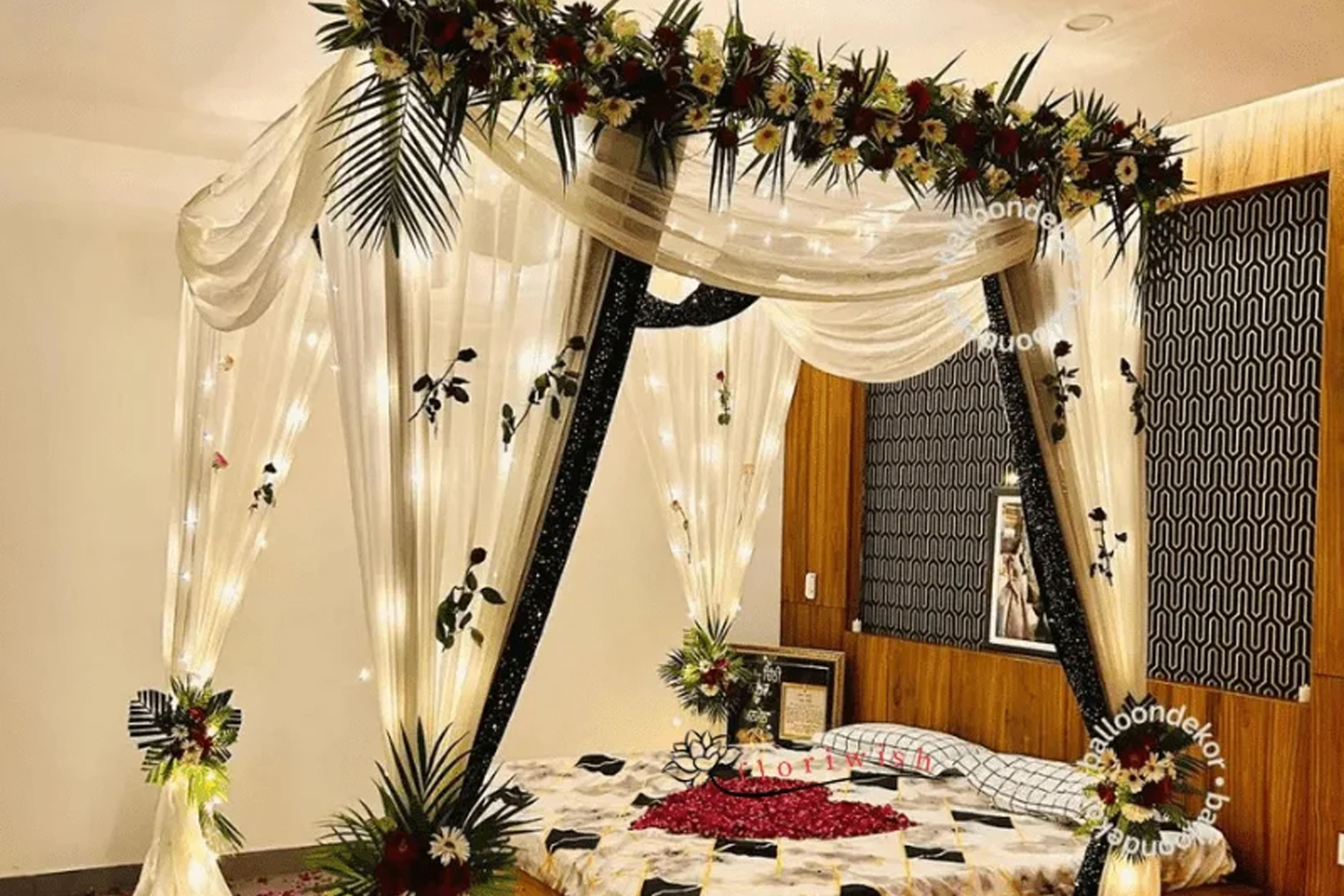 Romantic room decoration with roses, candles, heart designs, fairy lights, and beautiful bed décor to create a magical and memorable first night experience.